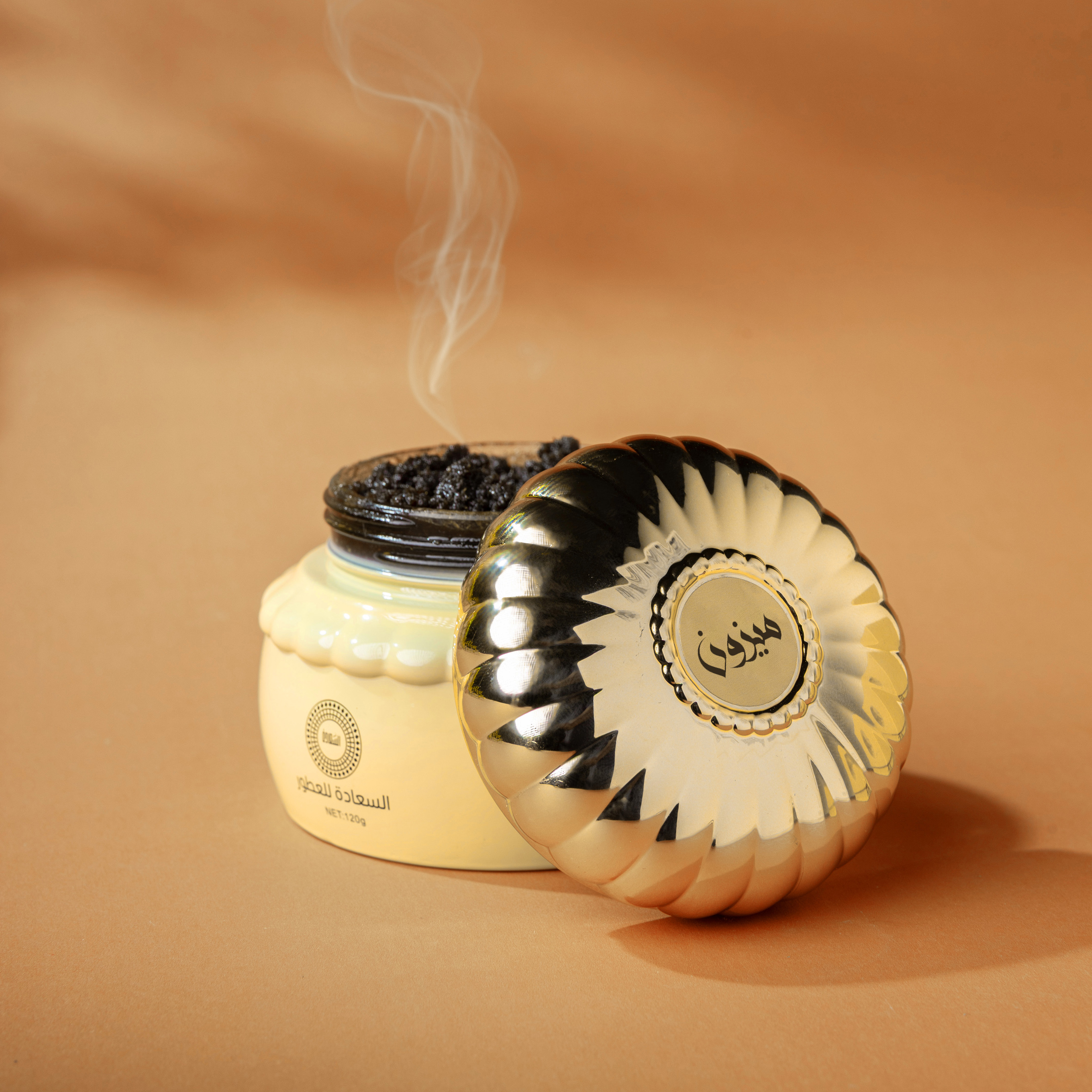 ومع انقضاء الوقت، تظهر القاعدة الغنية التي تميز هذا البخور، حيث تنبعث من البخور النقي العميق والزعفران الفاخر، الذي يمنح العطر طابعًا دافئًا وحسيًا. وتلتقي هذه المكونات مع النوتات الخشبية الفاخرة التي تضيف بعدًا آخر من الأناقة، لتخلق مزيجًا نهائيًا من الفخامة والهدوء يظل يملأ المكان لوقت طويل.